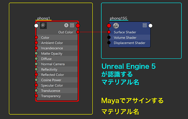 - Mayaでアサインするマテリアル(シェーダー)名と、Unreal Engine 5が認識するマテリアル(シェーディンググループ)名が違う。