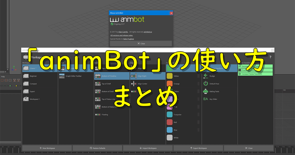 「animBot」はMaya用のアニメーション作成ツール(プラグイン)です。 有料のツールですが、Mayaでアニメーションを作成するためには非常に有用です。 「animBot」には様々なツールから構成されています。 それらのツールを一度にすべて理解するのは大変なの...