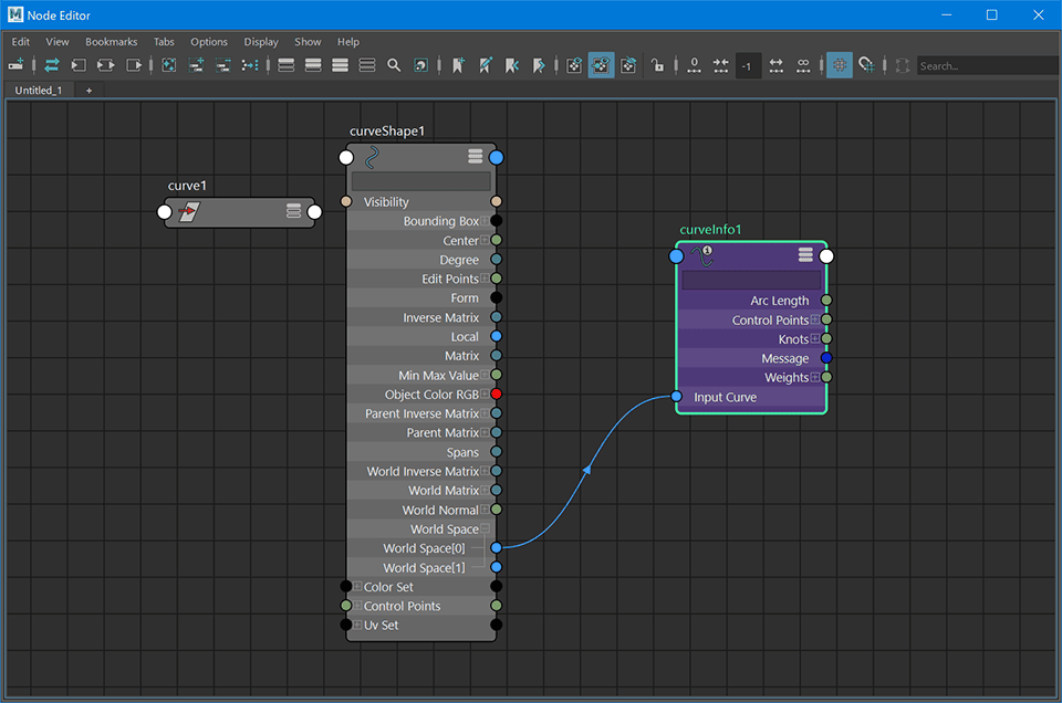 curveInfoノードの「Arc Length」というパラメーターにカーブの長さが格納されます。Attribute Editorを開いて確認してみてください。