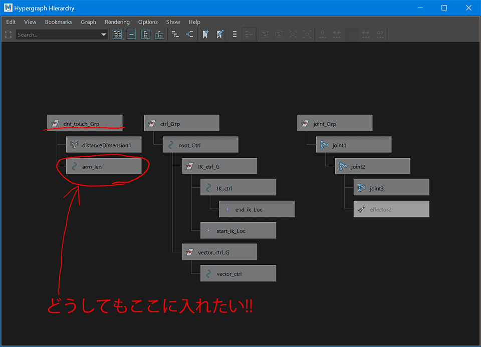 「dnt_touch_Grp」に入れるやり方はノードが増えてしまい複雑になってしまい(リガーの負担が増え)ます。しかし、コントローラーのグループにカーブ (非表示にするとしても) があると、アニメーターに触られて不具合を起こしてしまう可能性は十分にあります。後々の安全性を重視する上でも美的な面でも「dnt_touch_Grp」に入れるやり方のほうが良いでしょう。