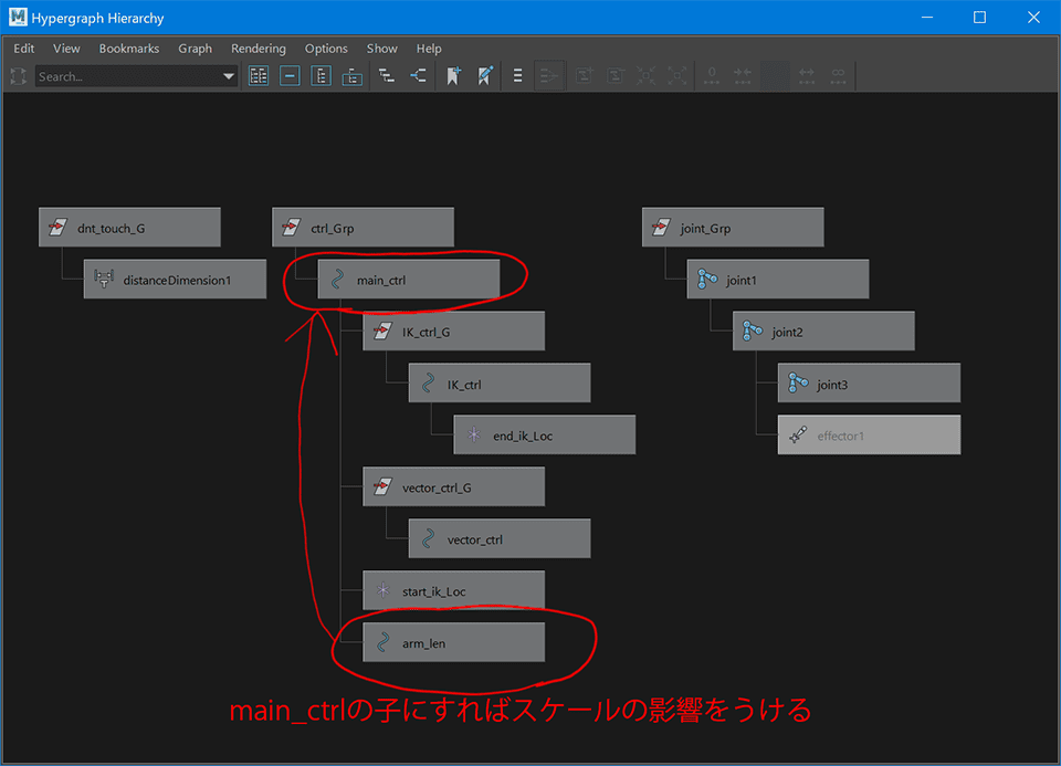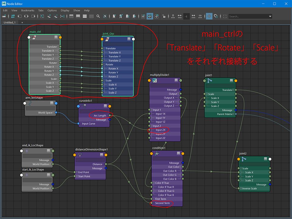 全体を制御できるように「main_ctrl」のTranslate、Rotate、Scaleを「joint_Grp」のそれらに接続します。