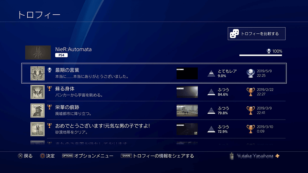 このゲームの場合はゲーム内のお金でトロフィーを買うことができるのでお金さえ貯めればだれでもトロフィーを獲得できます。しかし、私はすべてトロフィー取得条件を満たして取りました。まともにトロコンを狙ってもそれほど難しいものではありませんでした。